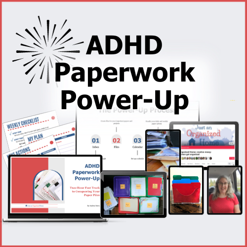The ADHD Paperwork Power-Up Workshop replay helps you clear real piles fast — without stress or perfectionism. In this 2-hour guided session, you’ll learn the same simple system I use with clients to reclaim counter space, set up an Action Inbox, and create a paper routine you can actually keep up with.