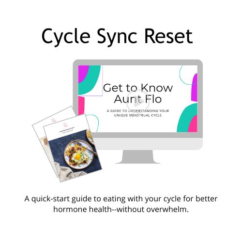 The Cycle Sync Reset is a quick-start hormone-supportive bundle with 33 easy meal and snack ideas tailored to your cycle phases—plus a short training that teaches you what’s happening in your body and how to support it. Perfect for busy women ready to feel better, naturally.